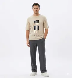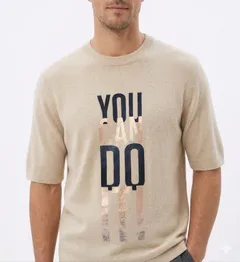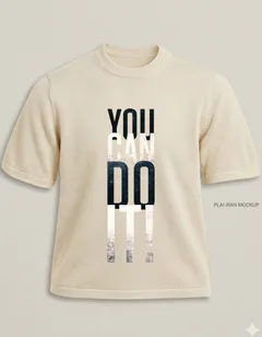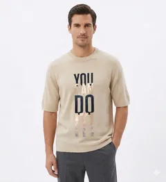 Comfortable light beige knit t-shirt featuring a motivational 'YOU CAN DO IT!' print with a distressed texture. Perfect for everyday wear.